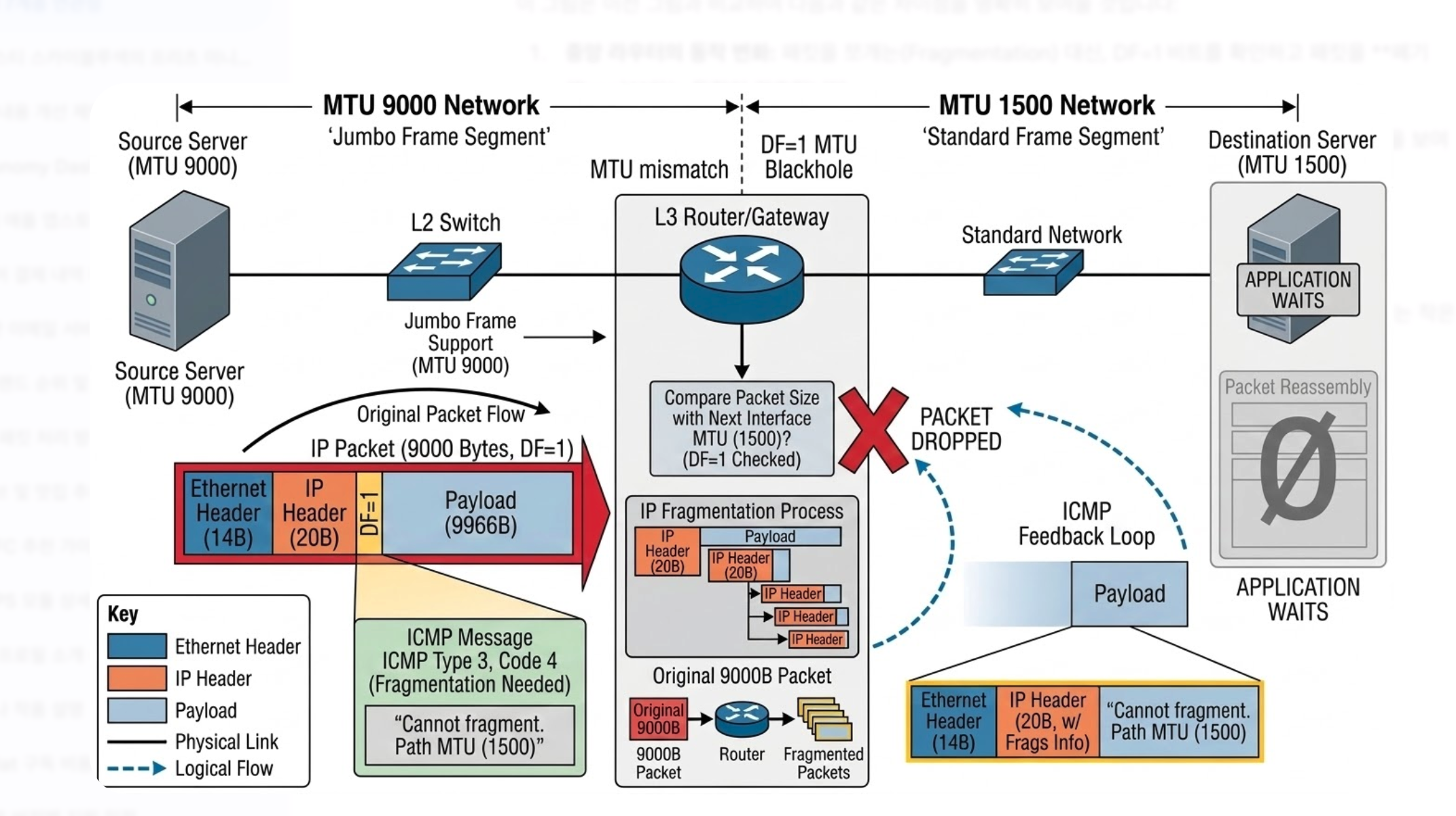- 라우터와 같은 3계층 장비는 경로상의 MTU 값을 확인하여 패킷을 전달하거나, 너무 클 경우 폐기하고 ICMP 메시지(Destination Unreachable)를 보냅니다.