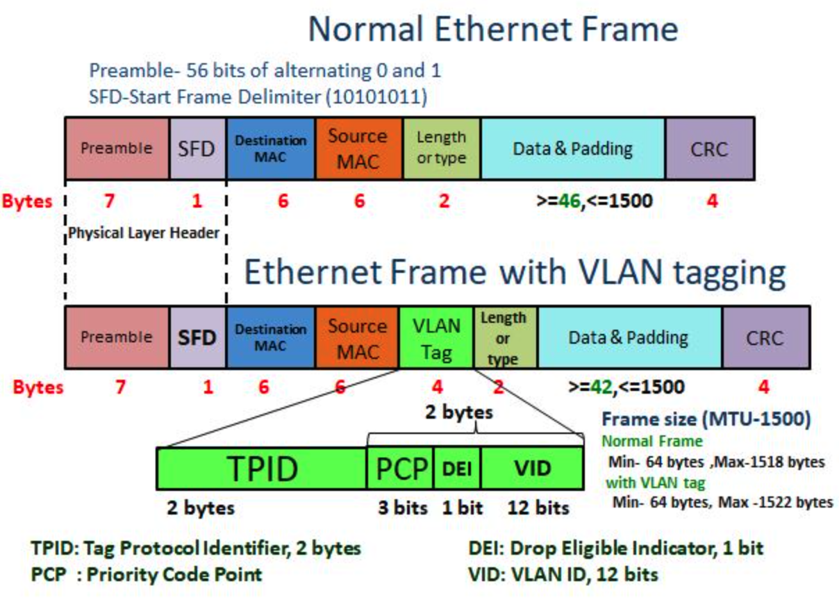 MTU 는 Ethernet payload 의 사이즈를 정의합니다. 따라서 실제 MTU가 1500의 Ethernet 의 사이즈는 ethernet header 14 bytes, CRC 4 bytes 를 포함하여 1518 bytes 가 됩니다. VLAN 을 포함하는 ethernet 구간이면 VLAN Tag 4bytes 가 포함되어 1522 bytes가 됩니다.